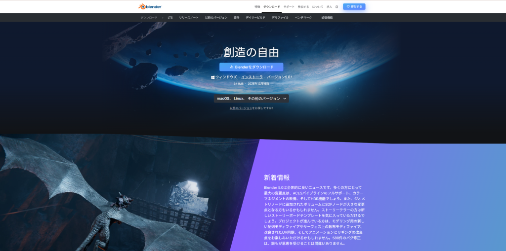 Blenderは公式サイトから入れました。まずはここからダウンロードします。