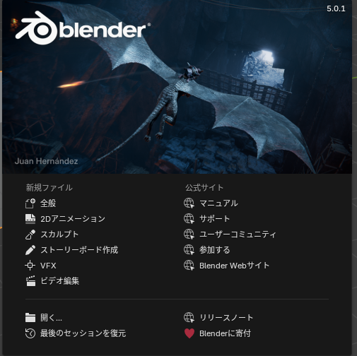 • Blender:起動時に表示されたバージョンは 5.0.1(私の環境)