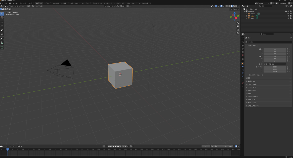 • alt:Blender作業画面の立方体(Cube)を選択した状態