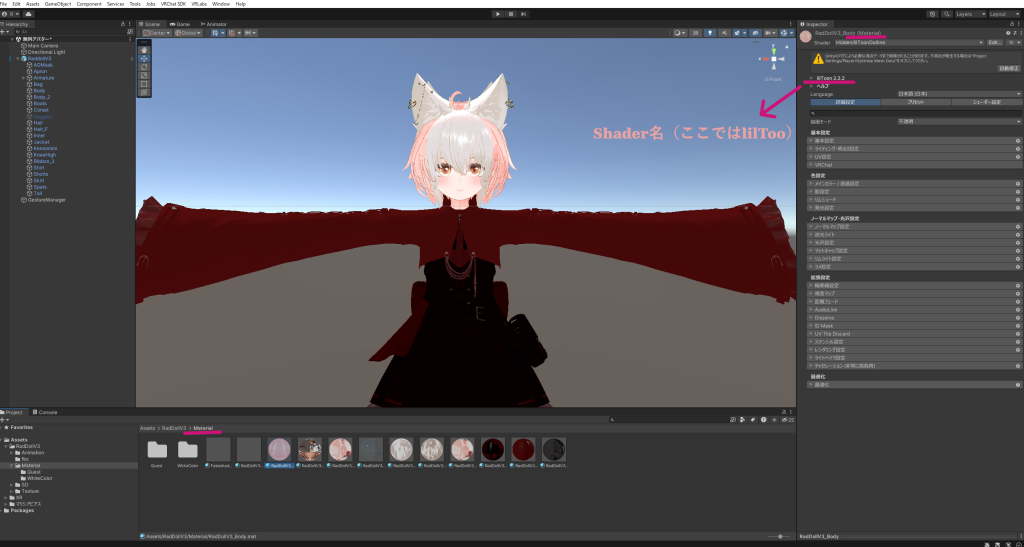 VRChatではPoiyomiやLiltoonなどのカスタムシェーダーがよく使われます。